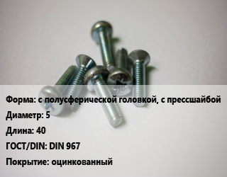 Винт с полусферической головкой, с прессшайбой 5х40 DIN 967 оцинкованный, 4.8, цена за шт, кг цена от 98.17 сом / кг, где купить, условия доставки в Бишкеке и Чуйской области