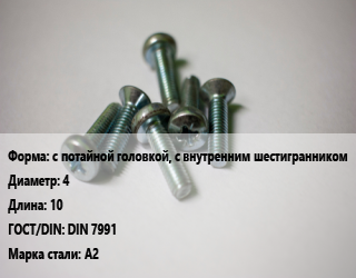 Винт с потайной головкой, с внутренним шестигранником 4х10 DIN 7991 Сталь: А2