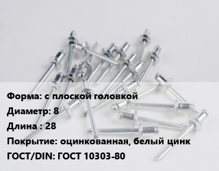 Заклепка с плоской головкой 8х28 оцинкованная, белый цинк ГОСТ: ГОСТ 10303-80