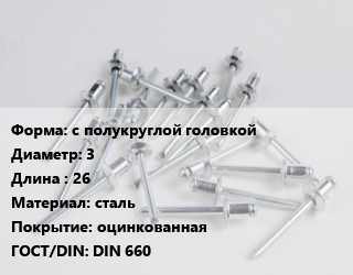 Заклепка с полукруглой головкой 3х26 сталь оцинкованная ГОСТ: DIN 660