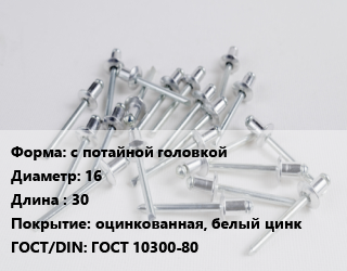 Заклепка с потайной головкой 16х30 оцинкованная, белый цинк ГОСТ: ГОСТ 10300-80