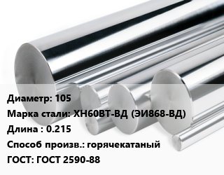 Круг нержавеющий 105 Сталь: ХН60ВТ-ВД (ЭИ868-ВД) L=0.215 горячекатаный ГОСТ: ГОСТ 2590-88