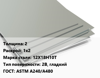 Лист нержавеющий 2 1х2 Сталь: 12Х18Н10Т Тип:2B, гладкий ASTM A240/A480