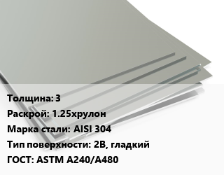 Лист нержавеющий 3 1.25хрулон Сталь: AISI 304 Тип:2B, гладкий ASTM A240/A480