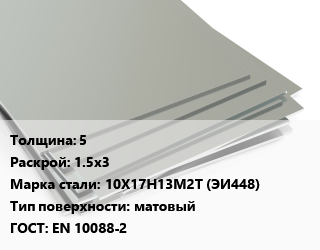 Лист нержавеющий 5 1.5х3 Сталь: 10Х17Н13М2Т (ЭИ448) Тип:матовый EN 10088-2