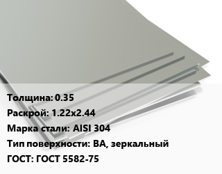 Лист нержавеющий 0.35 1.22х2.44 Сталь: AISI 304 Тип:BA, зеркальный ГОСТ 5582-75