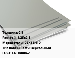 Лист нержавеющий 0.8 1.25х2.5 Сталь: 08Х18Н10 Тип:зеркальный EN 10088-2