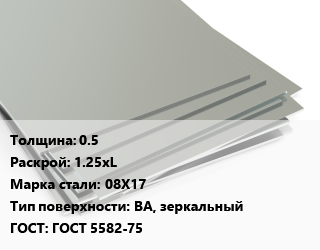 Лист нержавеющий 0.5 1.25хL Сталь: 08Х17 Тип:BA, зеркальный ГОСТ 5582-75