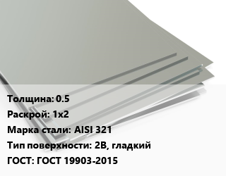 Лист нержавеющий 0.5 1х2 Сталь: AISI 321 Тип:2B, гладкий ГОСТ 19903-2015