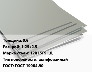 Лист нержавеющий 0.6 1.25х2.5 Сталь: 12Х15Г9НД Тип:шлифованный ГОСТ 19904-90