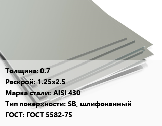 Лист нержавеющий 0.7 1.25х2.5 Сталь: AISI 430 Тип:SB, шлифованный ГОСТ 5582-75