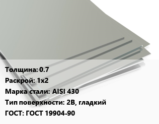 Лист нержавеющий 0.7 1х2 Сталь: AISI 430 Тип:2B, гладкий ГОСТ 19904-90