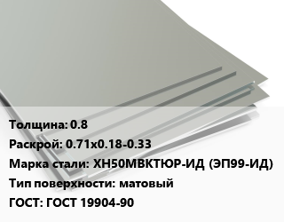 Лист нержавеющий 0.8 0.71х0.18-0.33 Сталь: ХН50МВКТЮР-ИД (ЭП99-ИД) Тип:матовый ГОСТ 19904-90