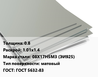 Лист нержавеющий 0.8 1.01х1.4 Сталь: 08Х17Н5М3 (ЭИ925) Тип:матовый ГОСТ 5632-83