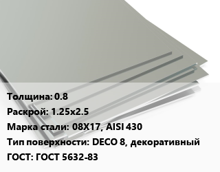 Лист нержавеющий 0.8 1.25х2.5 Сталь: 08Х17, AISI 430 Тип:DECO 8, декоративный ГОСТ 5632-83