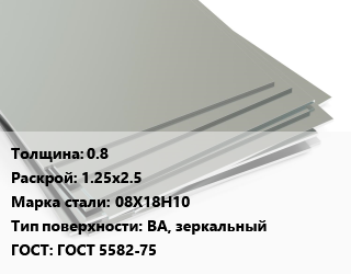 Лист нержавеющий 0.8 1.25х2.5 Сталь: 08Х18Н10 Тип:BA, зеркальный ГОСТ 5582-75