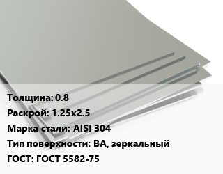 Лист нержавеющий 0.8 1.25х2.5 Сталь: AISI 304 Тип:BA, зеркальный ГОСТ 5582-75