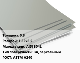 Лист нержавеющий 0.8 1.25х2.5 Сталь: AISI 304L Тип:BA, зеркальный ASTM A240
