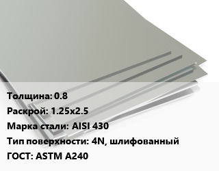Лист нержавеющий 0.8 1.25х2.5 Сталь: AISI 430 Тип:4N, шлифованный ASTM A240