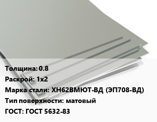Лист нержавеющий 0.8 1х2 Сталь: ХН62ВМЮТ-ВД (ЭП708-ВД) Тип:матовый ГОСТ 5632-83