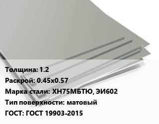 Лист нержавеющий 1.2 0.45х0.57 Сталь: ХН75МБТЮ, ЭИ602 Тип:матовый ГОСТ 19903-2015