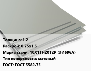 Лист нержавеющий 1.2 0.75х1.5 Сталь: 10Х11Н20Т2Р (ЭИ696А) Тип:матовый ГОСТ 5582-75