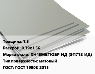 Лист нержавеющий 1.5 0.39х1.56 Сталь: ХН45МВТЮБР-ИД (ЭП718-ИД) Тип:матовый ГОСТ 19903-2015
