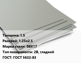 Лист нержавеющий 1.5 1.25х2.5 Сталь: 08Х17 Тип:2B, гладкий ГОСТ 5632-83