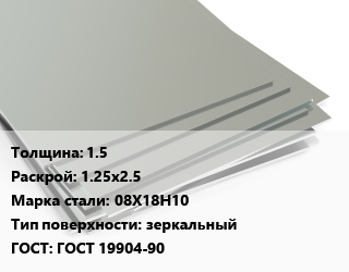 Лист нержавеющий 1.5 1.25х2.5 Сталь: 08Х18Н10 Тип:зеркальный ГОСТ 19904-90