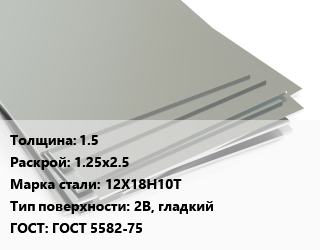 Лист нержавеющий 1.5 1.25х2.5 Сталь: 12Х18Н10Т Тип:2B, гладкий ГОСТ 5582-75