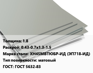 Лист нержавеющий 1.8 0.43-0.7х1.3-1.5 Сталь: ХН45МВТЮБР-ИД (ЭП718-ИД) Тип:матовый ГОСТ 5632-83