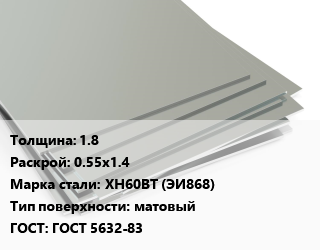 Лист нержавеющий 1.8 0.55х1.4 Сталь: ХН60ВТ (ЭИ868) Тип:матовый ГОСТ 5632-83