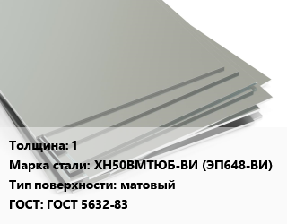Лист нержавеющий 1 Сталь: ХН50ВМТЮБ-ВИ (ЭП648-ВИ) Тип:матовый ГОСТ 5632-83