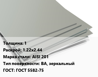 Лист нержавеющий 1 1.22х2.44 Сталь: AISI 201 Тип:BA, зеркальный ГОСТ 5582-75