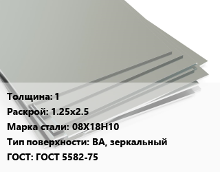 Лист нержавеющий 1 1.25х2.5 Сталь: 08Х18Н10 Тип:BA, зеркальный ГОСТ 5582-75