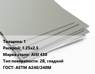 Лист нержавеющий 1 1.25х2.5 Сталь: AISI 430 Тип:2B, гладкий ASTM А240/240М