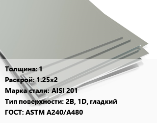 Лист нержавеющий 1 1.25х2 Сталь: AISI 201 Тип:2B, 1D, гладкий ASTM A240/A480