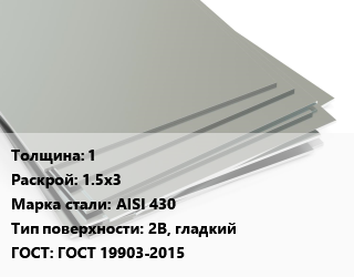 Лист нержавеющий 1 1.5х3 Сталь: AISI 430 Тип:2B, гладкий ГОСТ 19903-2015