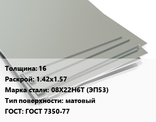 Лист нержавеющий 16 1.42х1.57 Сталь: 08Х22Н6Т (ЭП53) Тип:матовый ГОСТ 7350-77