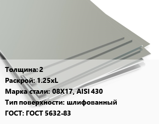 Лист нержавеющий 2 1.25хL Сталь: 08Х17, AISI 430 Тип:шлифованный ГОСТ 5632-83
