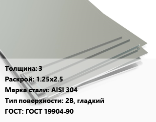 Лист нержавеющий 3 1.25х2.5 Сталь: AISI 304 Тип:2B, гладкий ГОСТ 19904-90