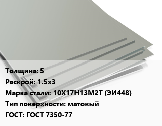 Лист нержавеющий 5 1.5х3 Сталь: 10Х17Н13М2Т (ЭИ448) Тип:матовый ГОСТ 7350-77