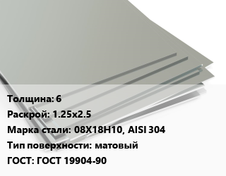 Лист нержавеющий 6 1.25х2.5 Сталь: 08Х18Н10, AISI 304 Тип:матовый ГОСТ 19904-90