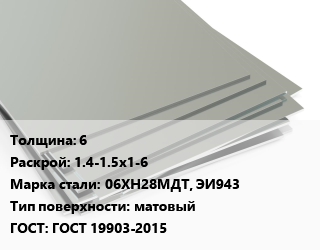 Лист нержавеющий 6 1.4-1.5х1-6 Сталь: 06ХН28МДТ, ЭИ943 Тип:матовый ГОСТ 19903-2015