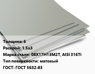 Лист нержавеющий 6 1.5х3 Сталь: 08Х17Н13М2Т, AISI 316Ti Тип:матовый ГОСТ 5632-83
