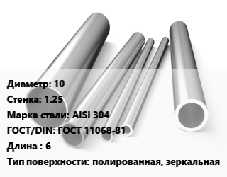 Труба нержавеющая 10х1.25 мм Сталь AISI 304 ГОСТ: ГОСТ 11068-81 L=6 полированная, зеркальная