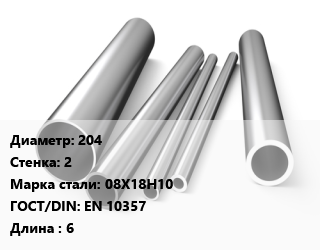 Труба нержавеющая 204х2 мм Сталь 08Х18Н10 ГОСТ: EN 10357 L=6