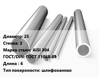 Труба нержавеющая 25х3 мм Сталь AISI 304 ГОСТ: ГОСТ 11068-81 L=6 шлифованная