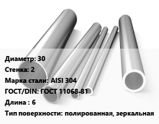 Труба нержавеющая 30х2 мм Сталь AISI 304 ГОСТ: ГОСТ 11068-81 L=6 полированная, зеркальная