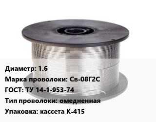 Проволока сварочная 1.6 Сталь: Св-08Г2С ГОСТ: ТУ 14-1-953-74 омедненная кассета К-415